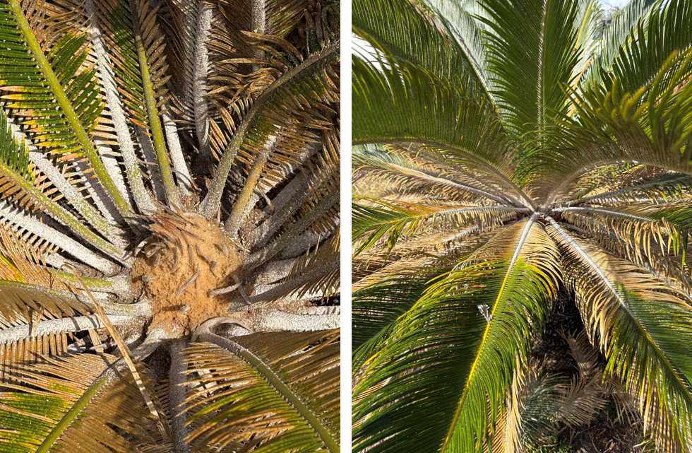 In the past few months, our field Arborists have noticed a drastic increase in Asian cycad scale infestation of sagos. They have observed many sagos all across the greater Houston area, presenting with a thick white coating starting at the trunk and spreading outwards, covering the fronds completely in the most serious cases. The arborists have noted that initial symptoms of infestation include small yellow spots on the upper surface of fronds, and as the infestation progresses, fronds become brown and desiccated.