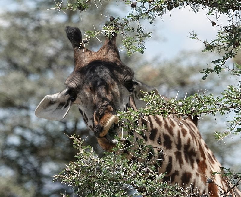 Giraffes are known to eat more than 100 different kinds of plants, but the acacia tree is a favorite because its leaves and blooms are rich in protein, water, and calcium, all of which are especially valuable in the harsh savannah environment. It is essentially a superfood, and over generations, giraffes have adapted to be able to eat it in fascinating ways.