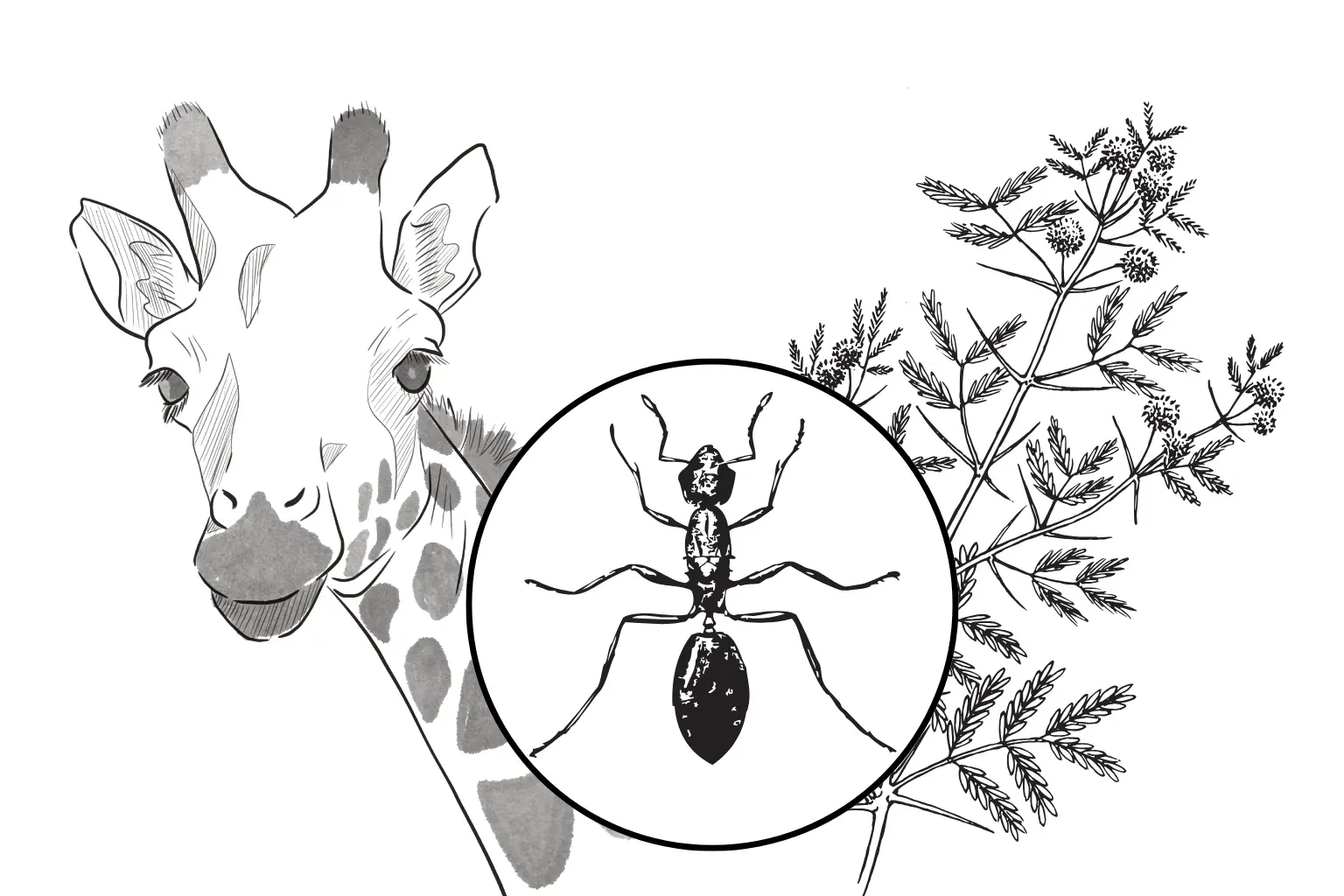 *The image above is from The Wild Nature Institue, it shows a giraffe browsing on a tree and if you look closely at the branches of the tree, you can even see the little ant colonies presents in the bublbs just beneath the thorns*